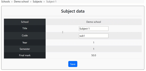 - Define subjects with details such as title, code, final mark, and year-semester combination.