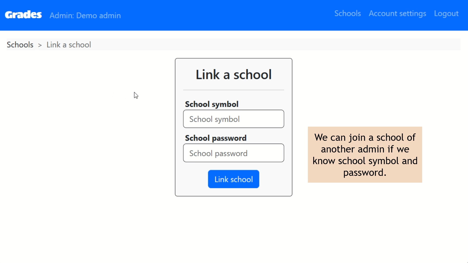 - Create new schools or join existing ones using a unique symbol and password for admin collaboration.